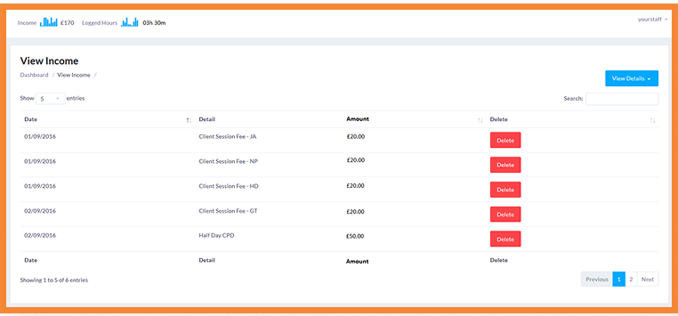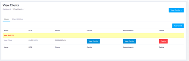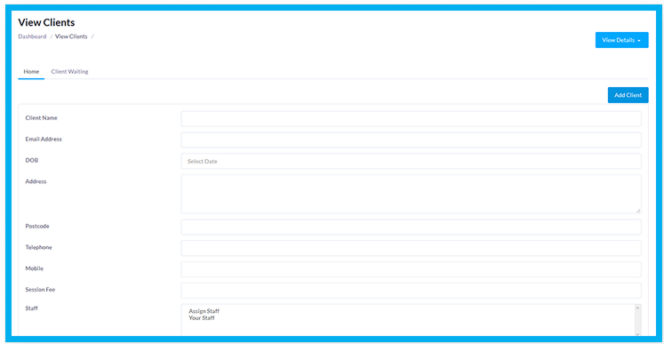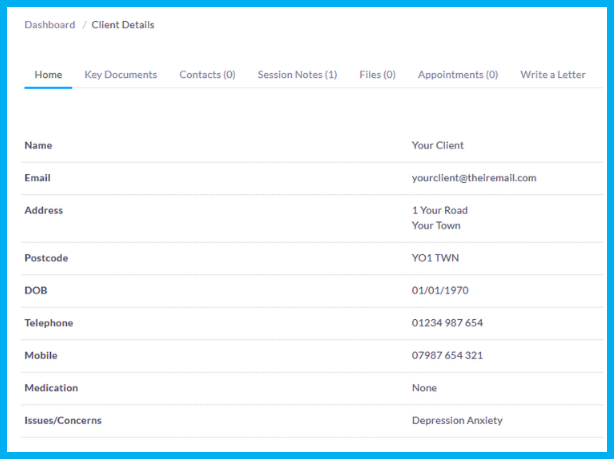 All of our client files are stored in a single location – add and view client details, other professionals, session notes, files, manage your appointments, and produce letters all from the client area.